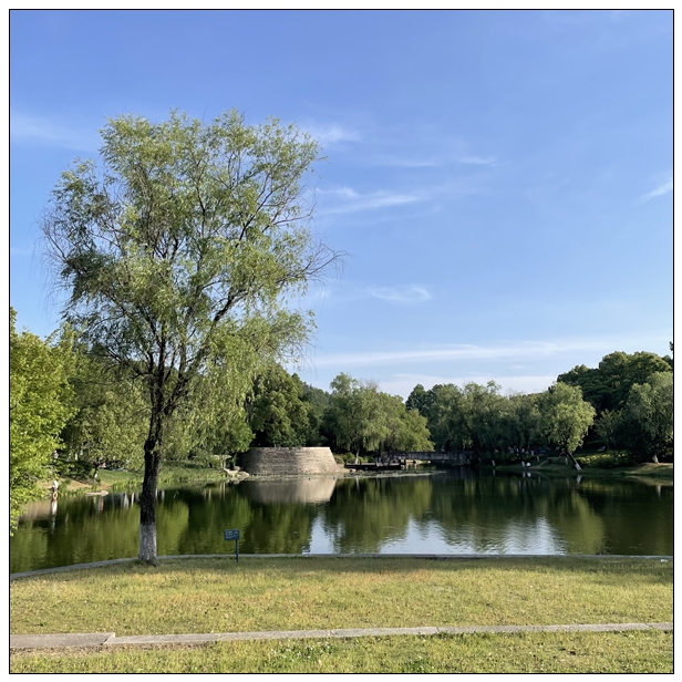 良渚博物院在美丽洲公园内,湖光山色,绿树成荫。太阳也给力,显得树更绿,水更清。从东南门进,先一座小桥,桥边一块大石头,上面刻着:良渚博物院。