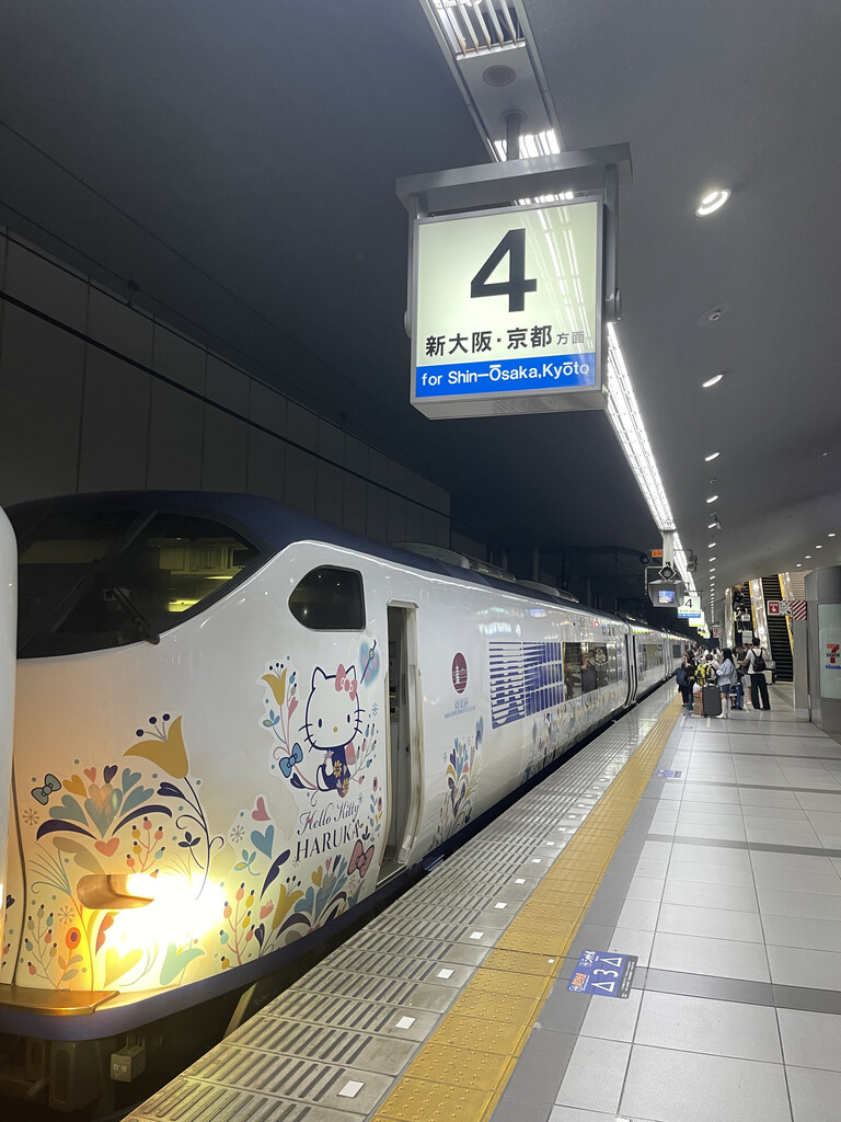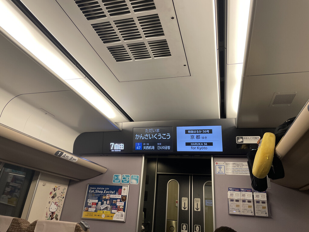 提前在klook上买了Haruka车票,在蓝色Gate B刷二维码顺利进站,按指示去4站台;天气有些热的,10分钟左右,Haruka到达。先清扫,车方向不变,座椅调到面向前进方向,可180度旋转的座椅很酷。Haruka指定席已满,自由席反倒没人,整个车厢4个人吧,干净且安静。准时发车20:46,准时到达,用时1h17分。只是晚上,外面漆黑,什么也看不见,闭目养神。
