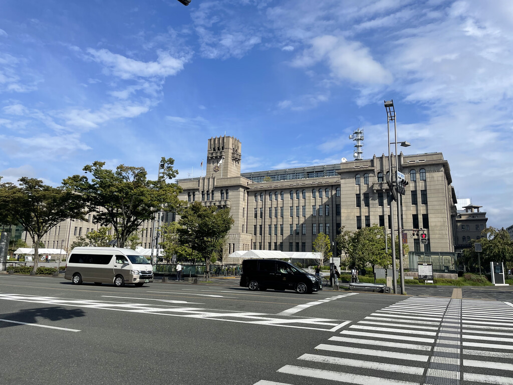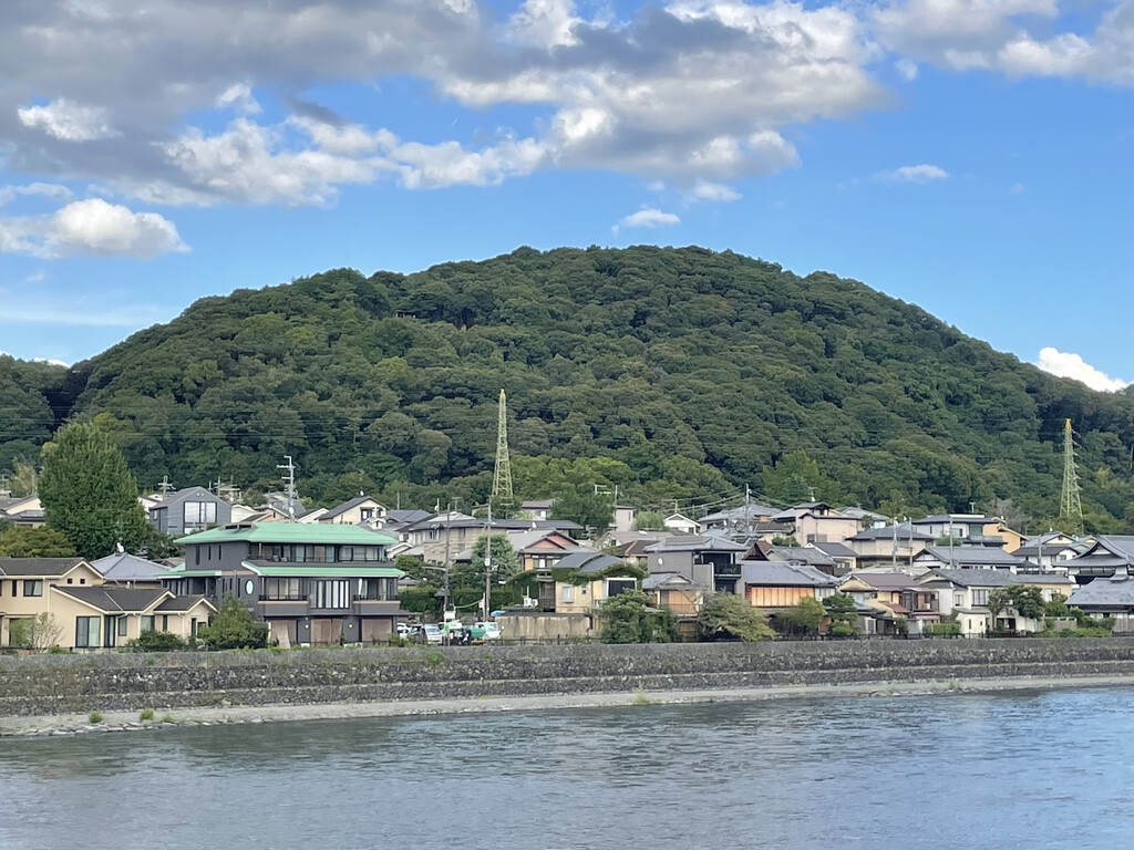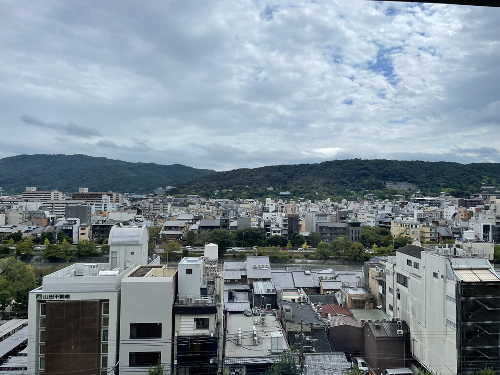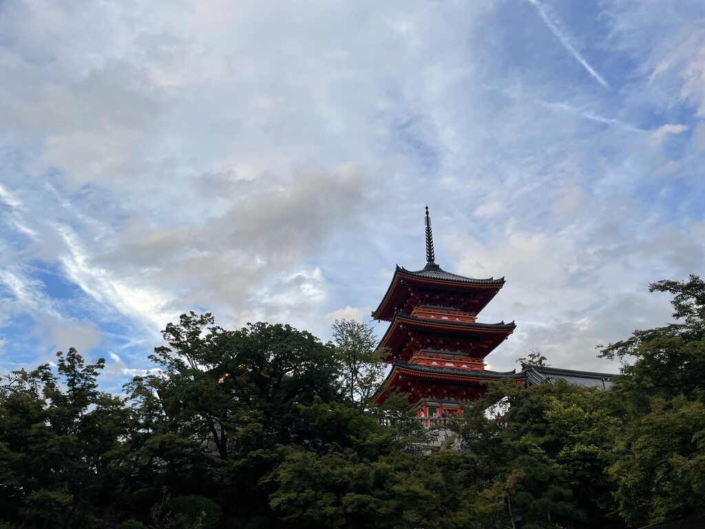 沿五条通向东,车上看到京都的街景,很干净,天气也很好,天很蓝,远处的清水山清晰可见。
