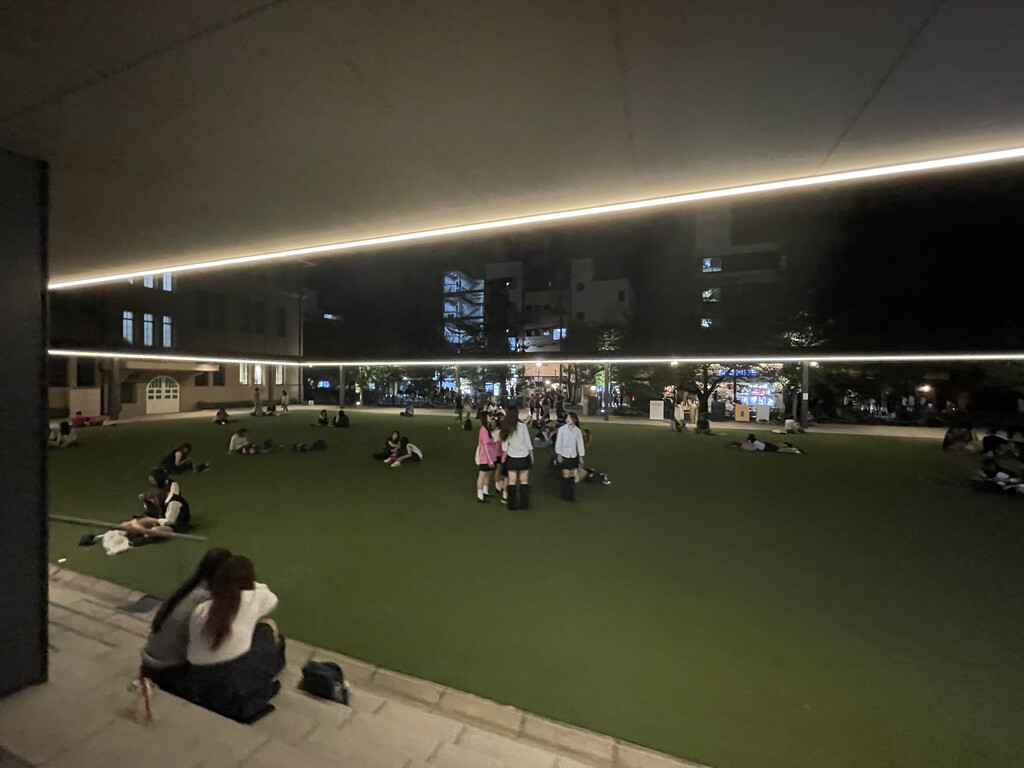 步行回酒店,The gate hotel就在高濑川旁边,一条浅浅干净的小河,晚上,多了些人坐在河边喝酒聊天。回头才知道,河两边多是樱花树,难以想象春天花开该有多美。酒店是学校改建,保留了小操场,就邻着河边。人们悠闲的坐在操场上,很惬意。