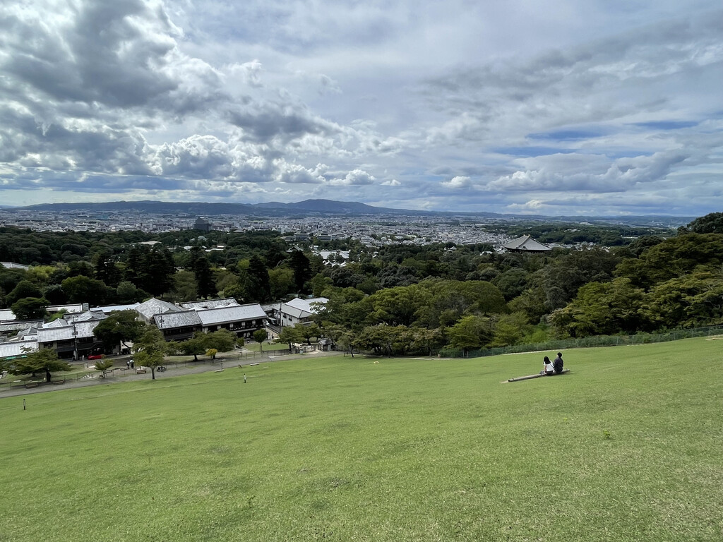 再去若草山,一片青青草原铺满山坡,爬到半山腰,就可俯瞰奈良。