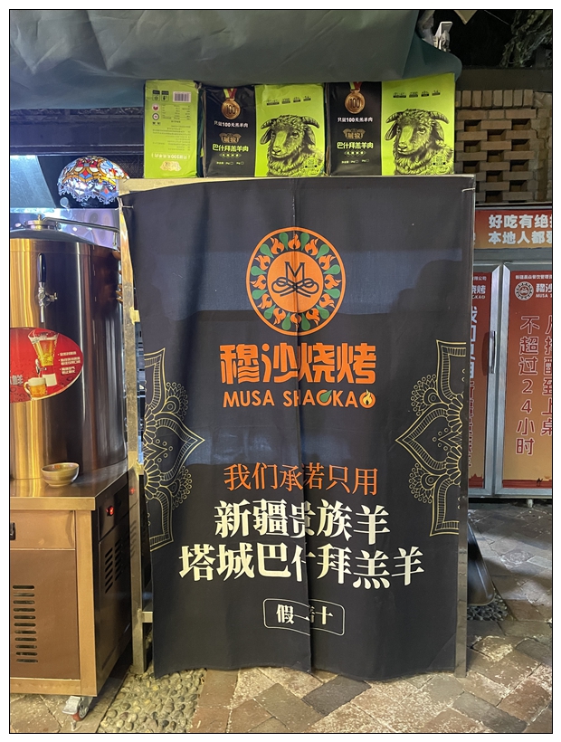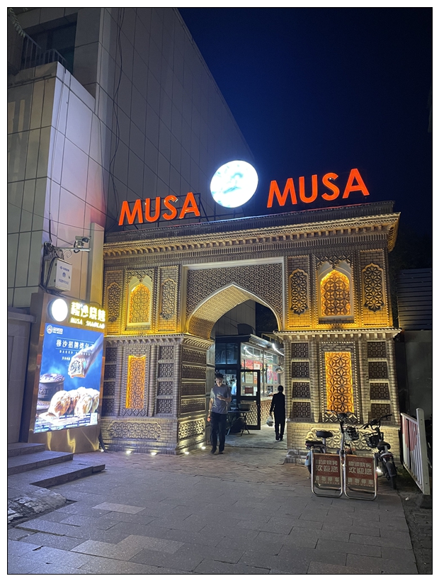 到了穆沙烧烤,看见伊斯兰风格的大拱门,感觉这个店错不了。我们晚上九点半到,里面熙熙攘攘,新疆人吃饭晚。