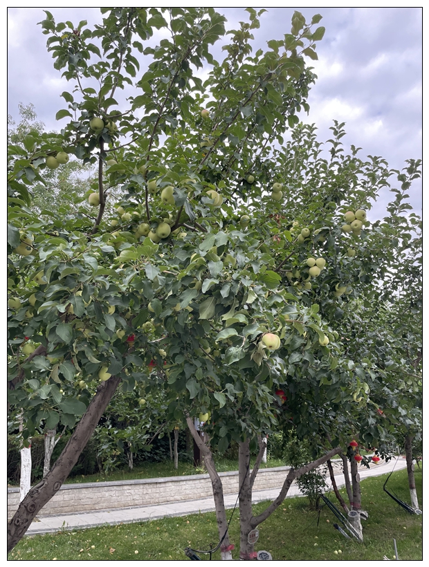 昆仑宾馆的早餐丰富,各种特色小吃,做得也好。椒麻鸡是这次新疆之行最好的。吃完饭,准备宾馆外面散散步。前台服务员好心告诉我们院子有很多苹果树,果子可以摘。我们好奇地去看,果子还青。果树就在路边,我说这果子放在西安活不过一周。