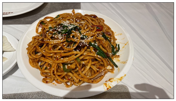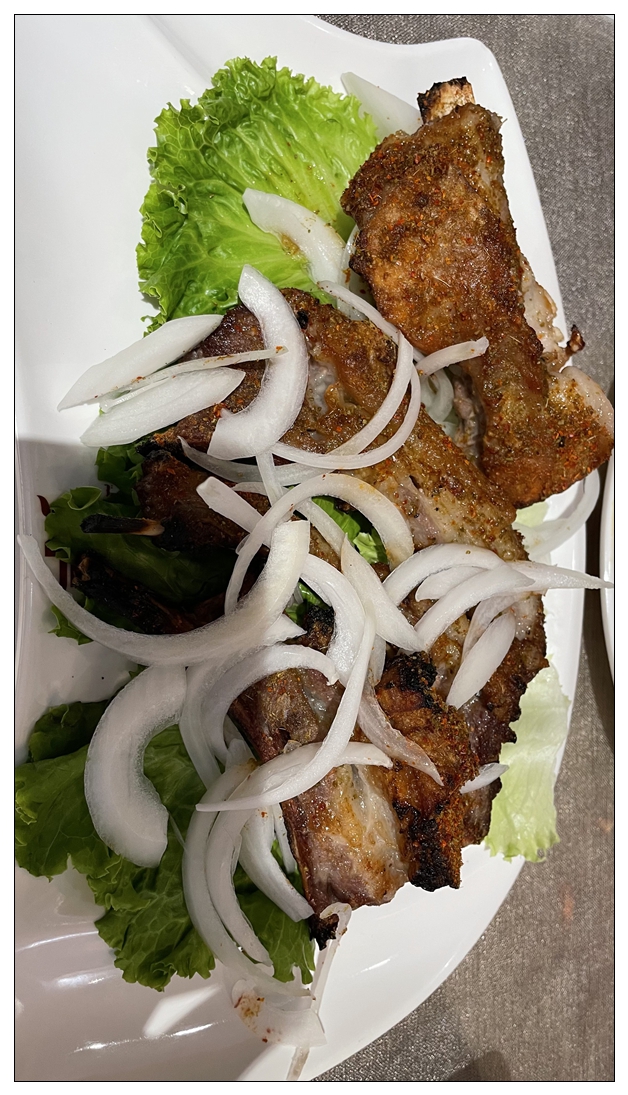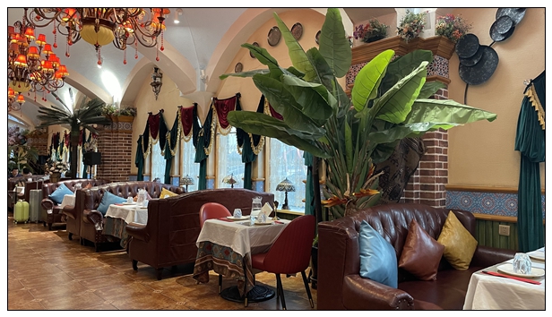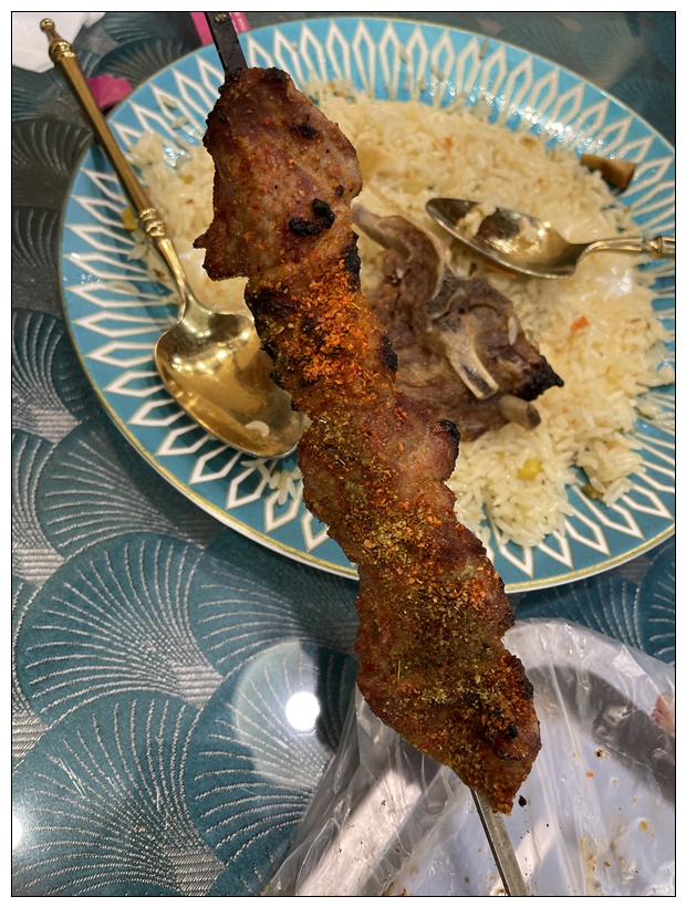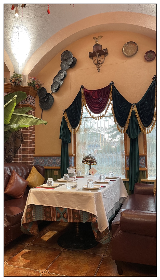 下午酒店休整。19点多去艾莱茵吃晚饭,这是一家维族特色的餐厅。进去之后发现,装修确实很民族特色,很好看。双语菜单,汉语和维语。有些服务员不太会讲普通话。跟着点评点菜,干煸拉面,椒麻鸡凉面,薄皮包子,小份烤羊腿。都是小份菜。而我们隔壁桌来了三个年轻人,就点了一份大盘鸡,那个盘,真的巨大。这也是这次没吃大盘鸡的原因,遗憾。吃完饭已经九点多,天完全黑了,回去休息,准备第二天的行程。