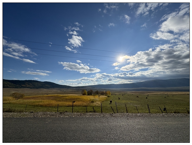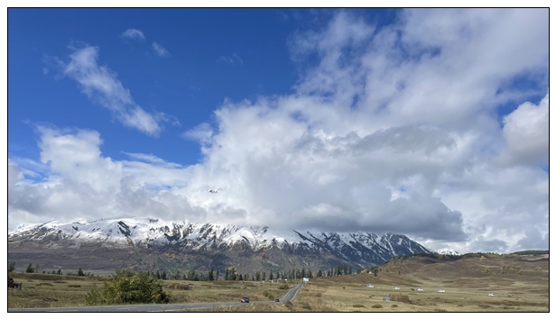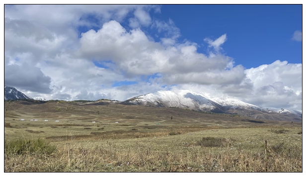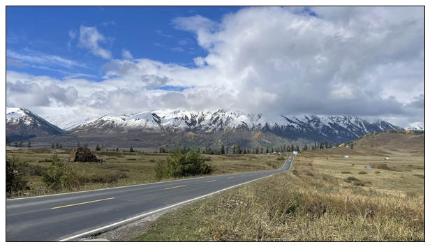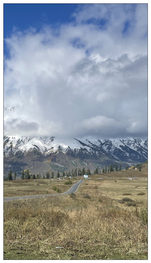出了禾木村,外面就没什么游客了,沉浸在雪山草原之间,特别放空和舒畅。这阵太阳也特别好,我们在路边停车,下车拍拍照。对面不停的大巴呼啸而过,把一堆堆的人送往禾木村。