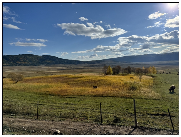 这条村道两边是大草原,中间间或有牧民的村庄,安静祥和。偶见两个哈萨克大哥骑在马上隔着公路聊天。印象比较深的是阿克布拉克村附近,有一篇草原,秋天的红红黄黄,一头黄白相间的牛悠闲在站在其中,慢悠悠的风吹过,很是惬意。